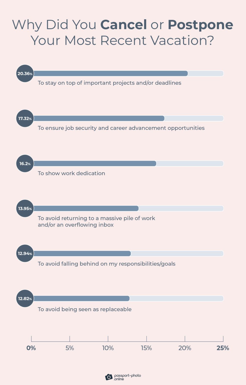 As you can see, the #1 reason to cancel or postpone a vacation is “to stay on top of important projects and/or deadlines” at 20%. It’s closely followed by ensuring job security and career advancement opportunities (17%) and showing dedication (16%).