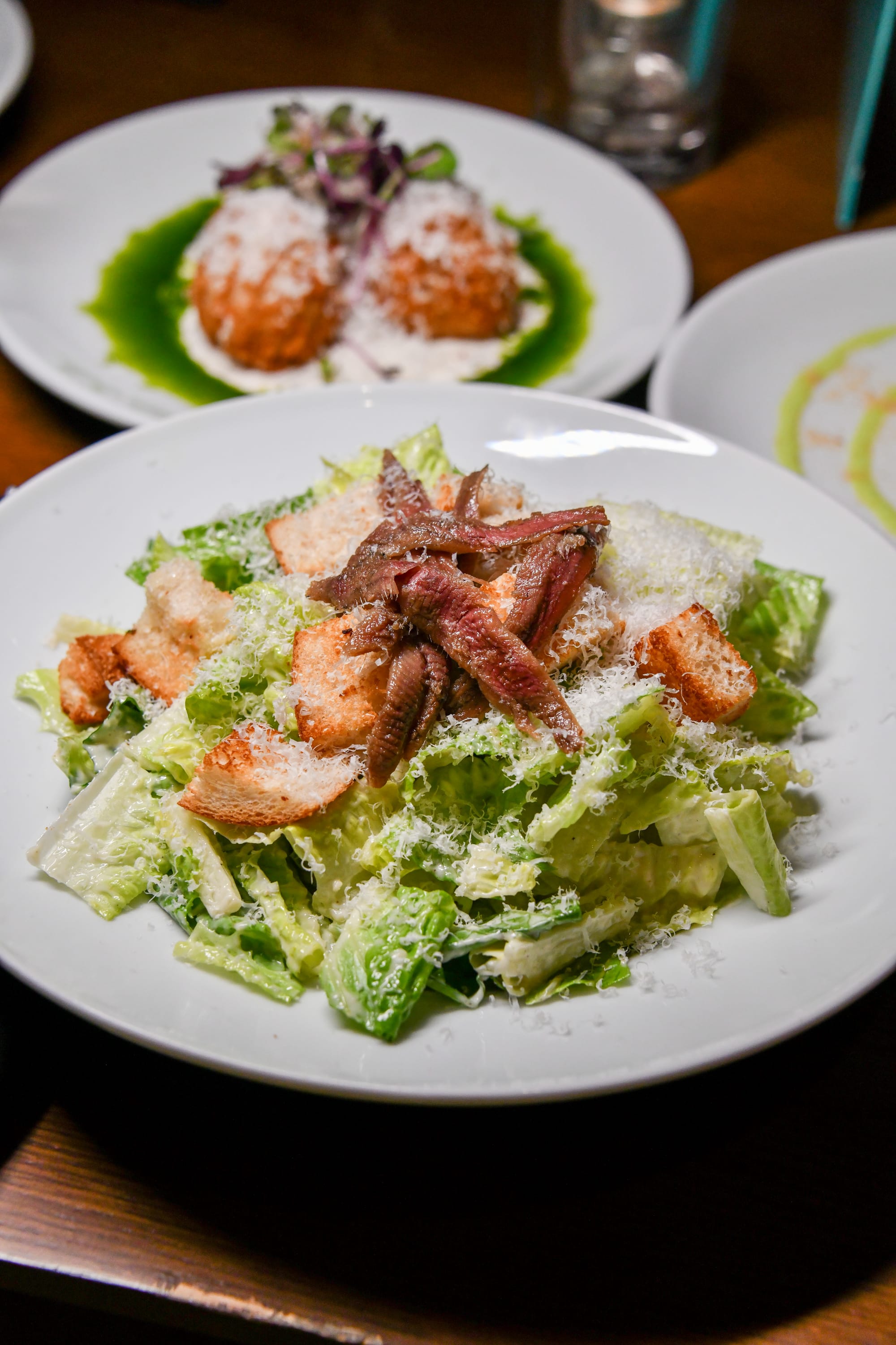 Playful Italian-American dishes include arancini or Caesar salad, chicken parmigiana or rigatoni bolognese, and pistachio cheesecake with white-chocolate ganache and biscotti.