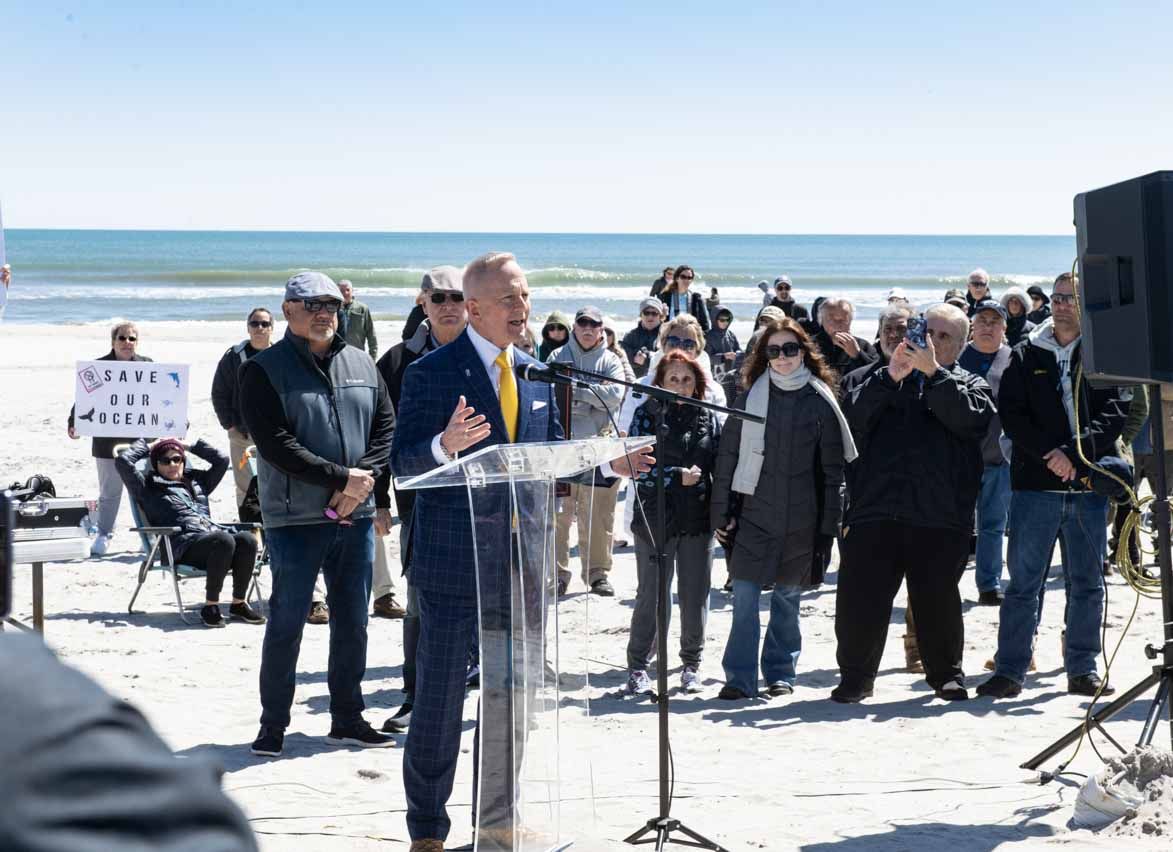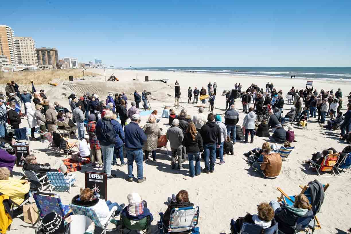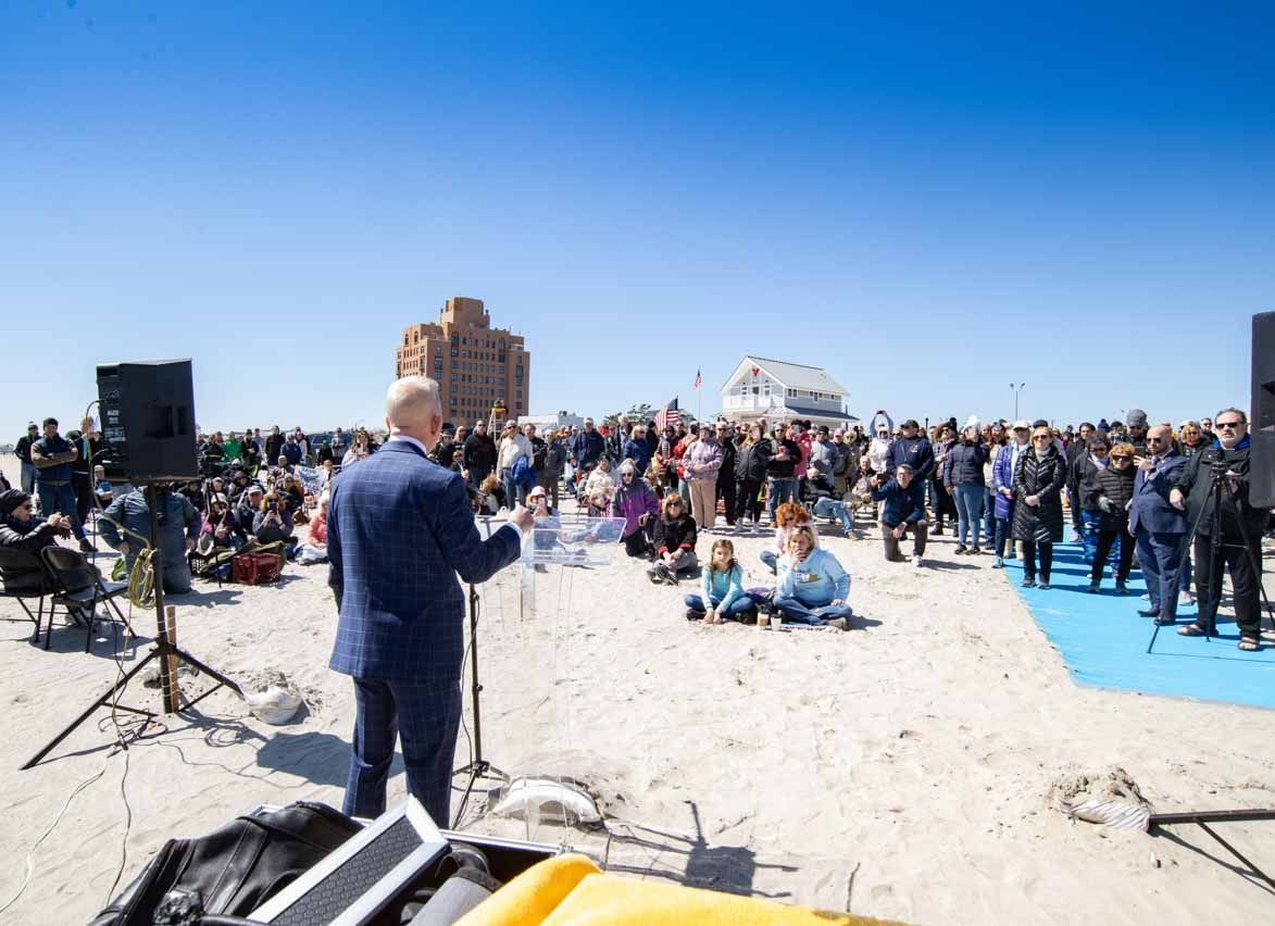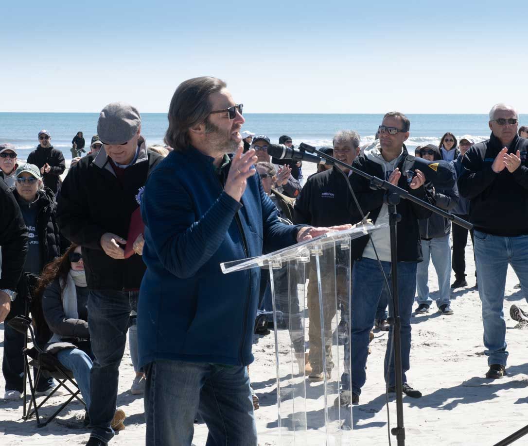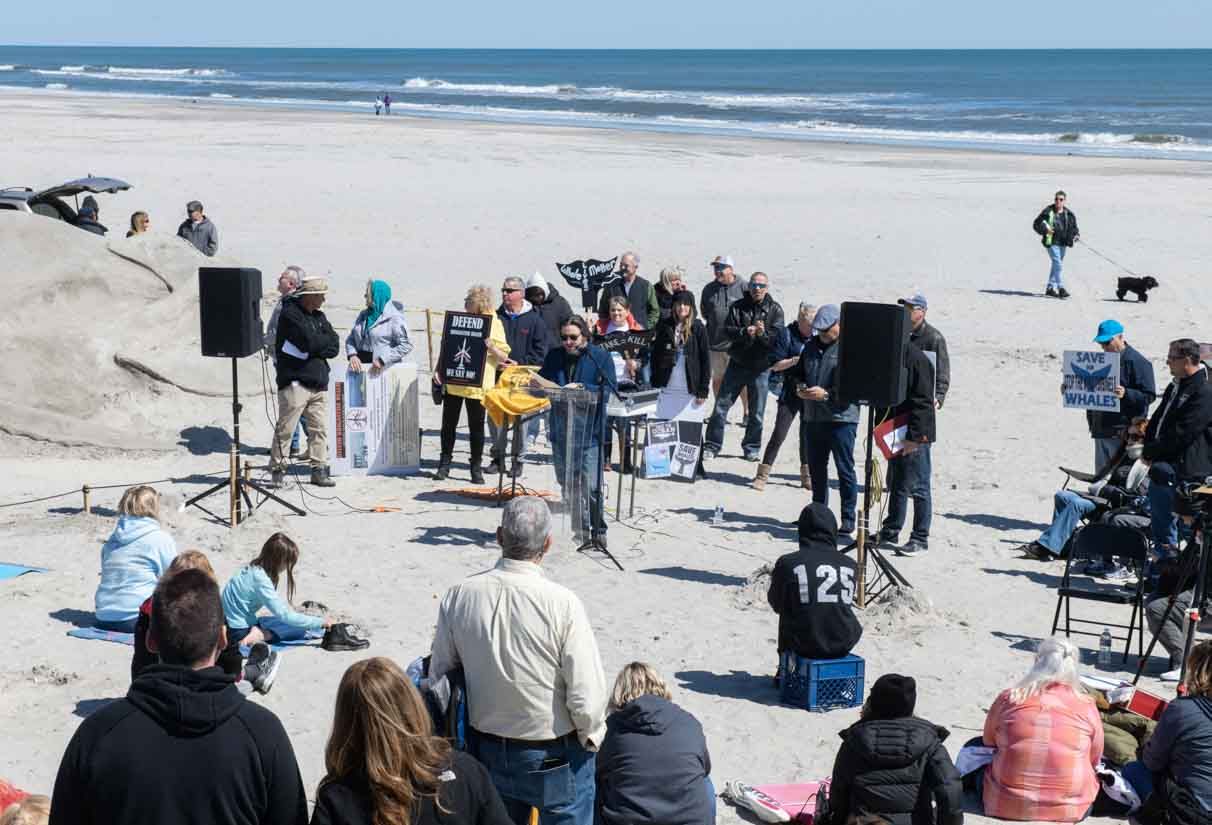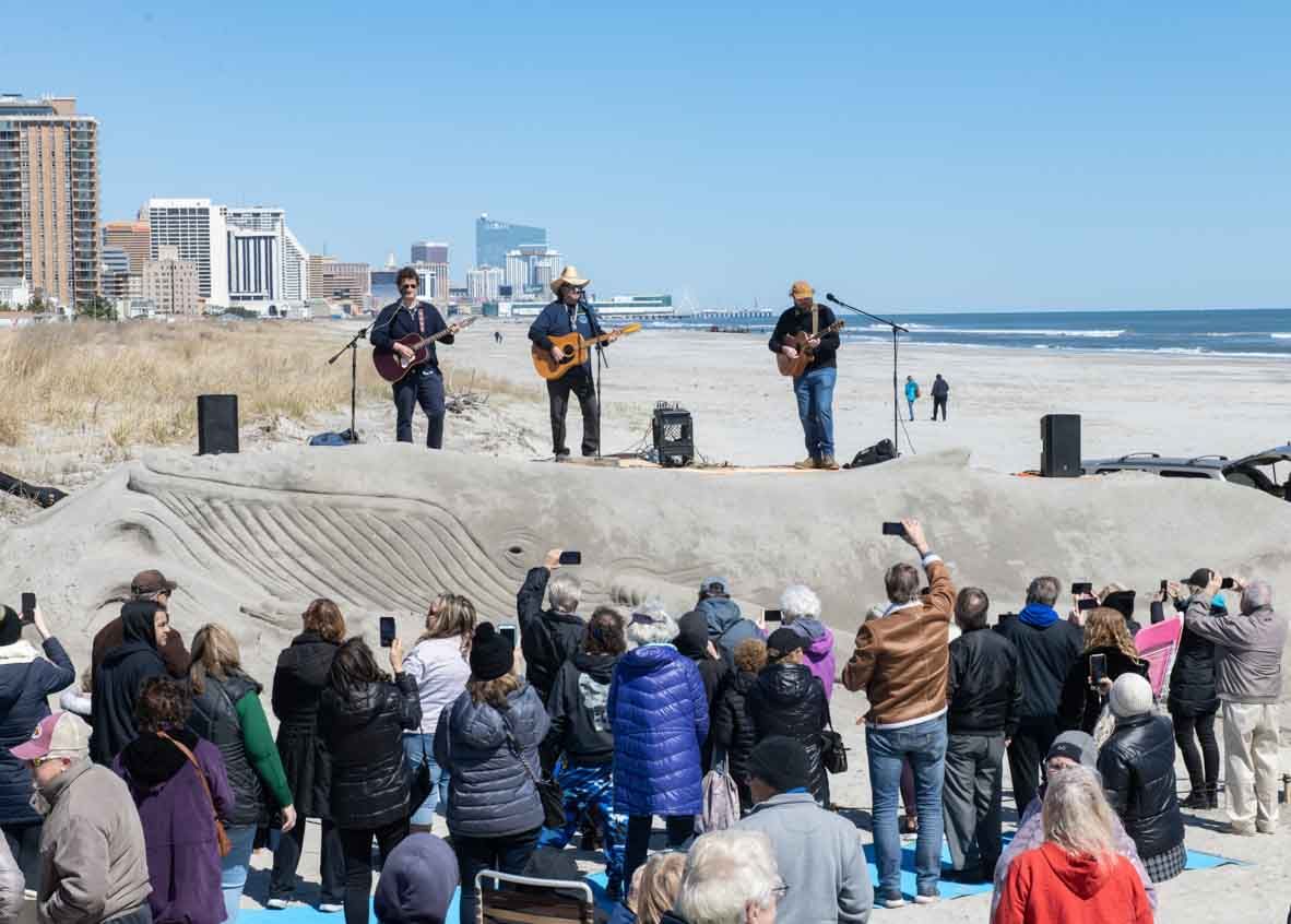 Johny Higbee sung his just released song “Save The Whales” with The Blue Street Band and on a stage on top of the sand sculpture.