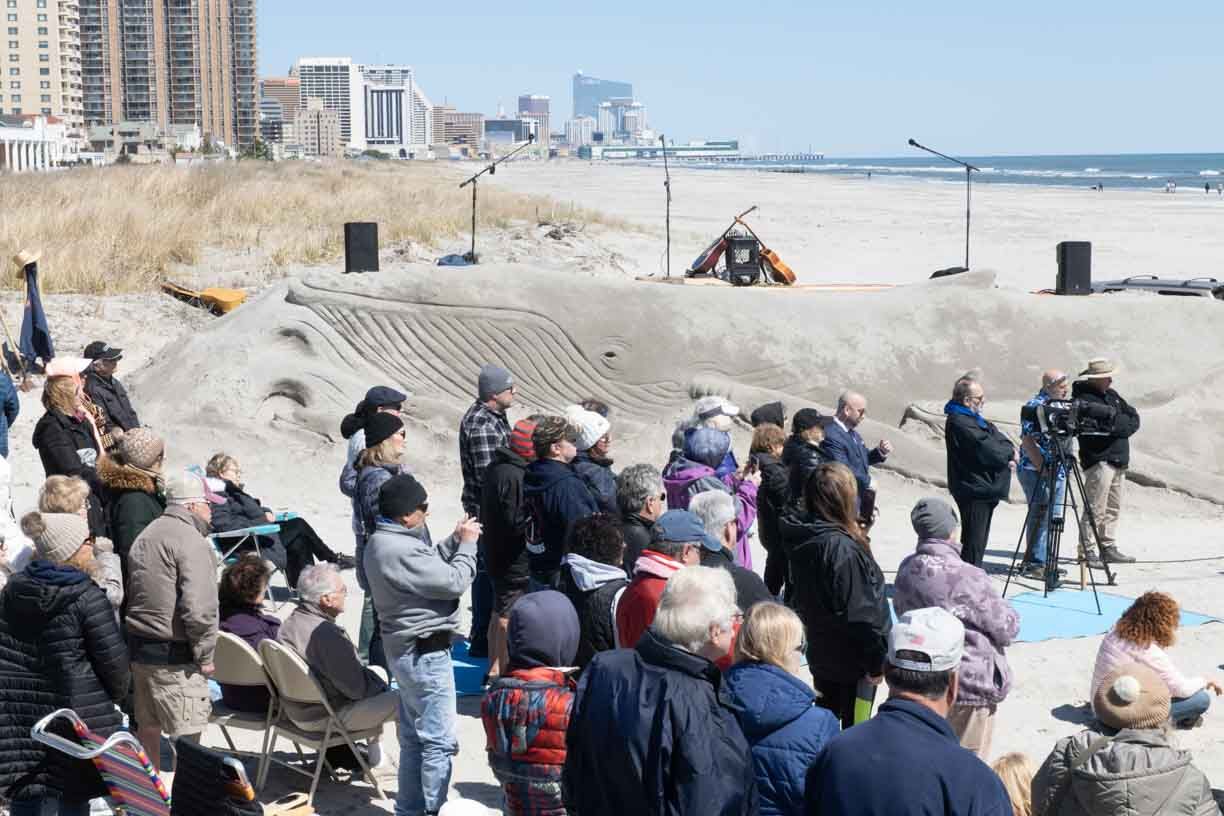 The sand sculpture is located on the beach at Suffolk Ave in Ventnor City just a short distance from the burial sites of two beached humpback whales in Atlantic City.