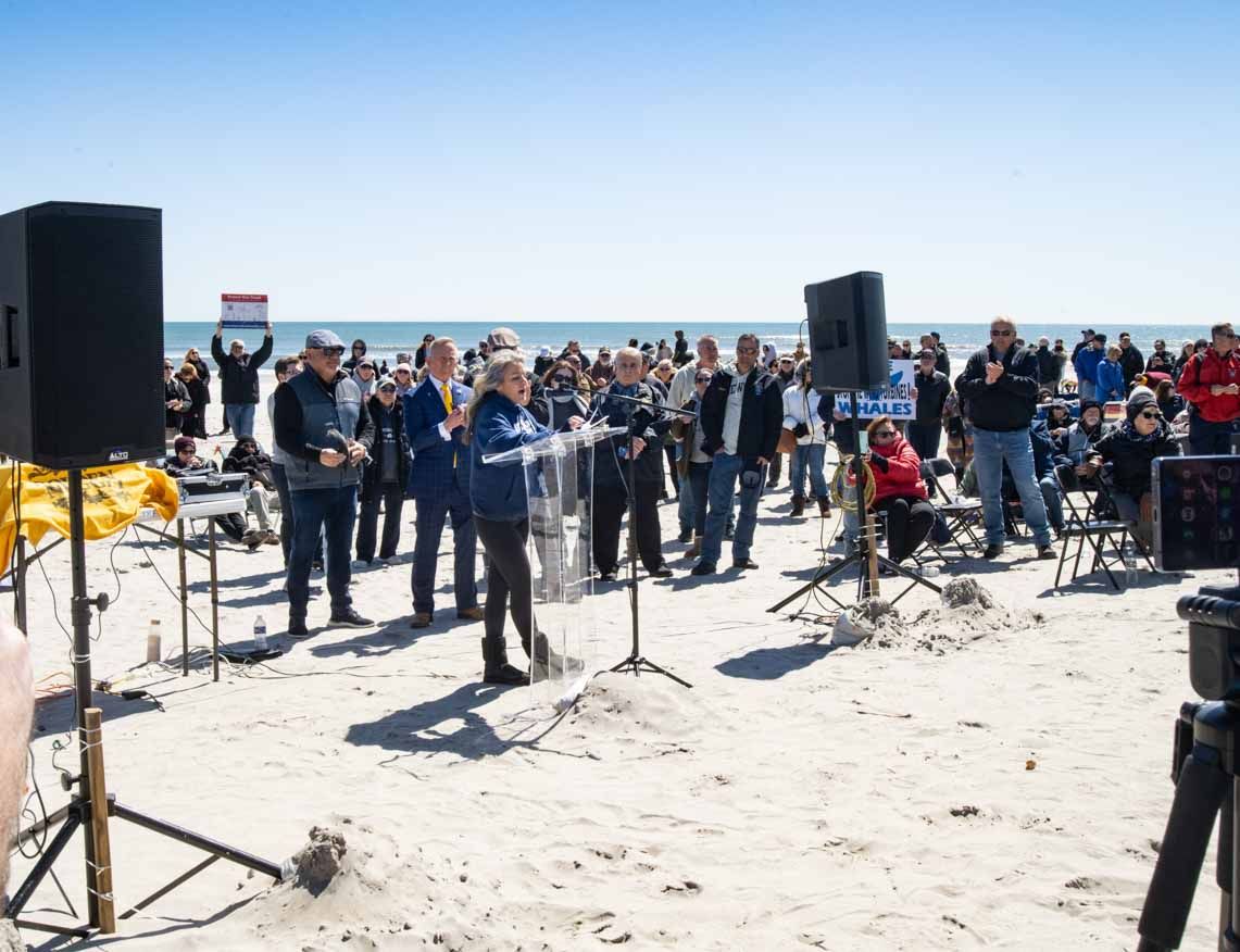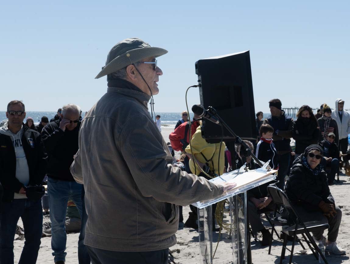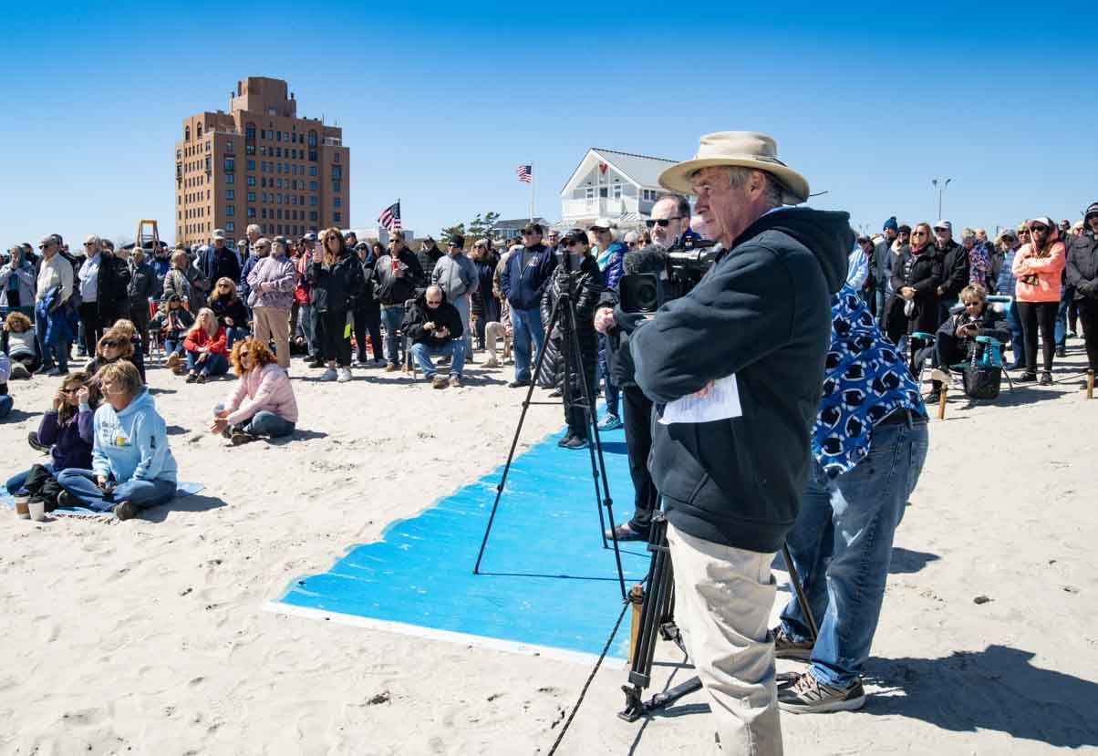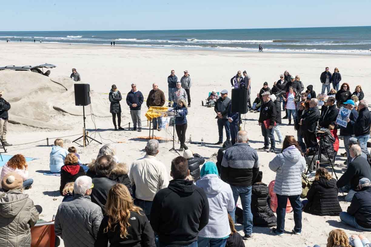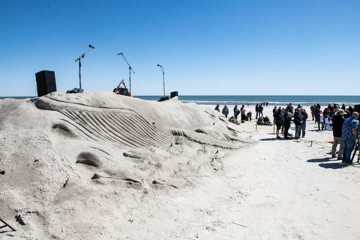 Representing the art community many locals gathered front of a life-size, 42 feet long, humpback whale with her calf, sculpted entirely in hundreds of tons of beach sand.
