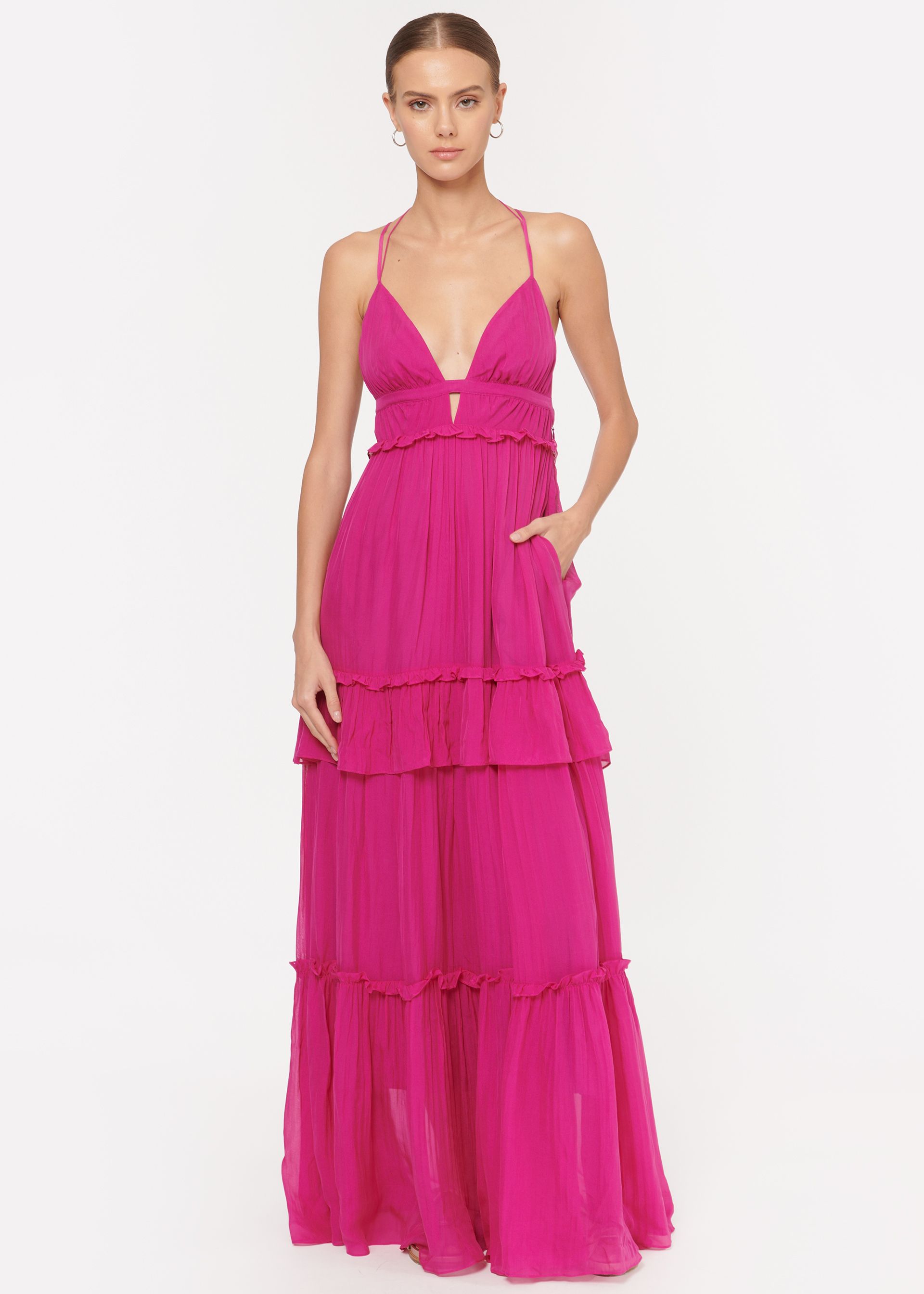 Briana has some solid bright dresses made for keeping the focus on you, from a full-length hot pink maxi from Cami NYC, and a bright blue casual summer dress from Nation LTD to a neon pink number from Sundry, but our very favorite has to be the bright green jumper from Show Me Your Mumu. The utilitarian cut can be dressed up with a pair of strappy sandals or kept low-key for your post-beach cocktails.
