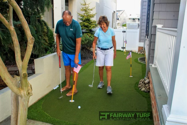 Fairway Turf and Artificial Grass also installs a wide variety of artificial lawns. “We specialize in various types of Artificial Grass Installations. Residential lawns, putting greens, pet turf, pool areas, playgrounds, sports courts, and much more! We install many custom-designed putting greens and chipping areas, which allows our clients to work on their golf game from home. This creates a unique entertainment area for family and friends to enjoy. We pride ourselves on knowing we’re giving our clients the best products on the market, ensuring them an always clean and forever green lawn for many years to come!” Vassallo says.