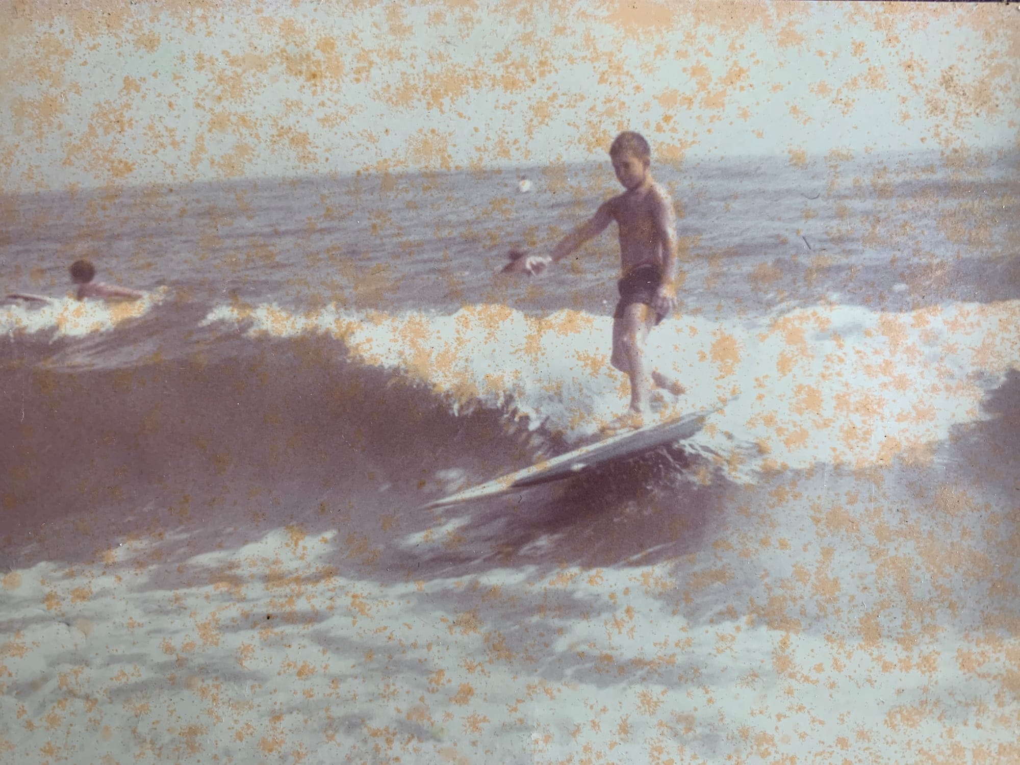 This shot was taken by Mark's father standing in waist deep water with an Instamatic camera, where Mark grew up. They lived at Fredricksburg Ave. and the beach. Mark was 11-12 years old and didn't have his own board yet. They used to borrow boards from the older kids when they would let them paddle out and get a few rides. Photo - Harry Neustadter
