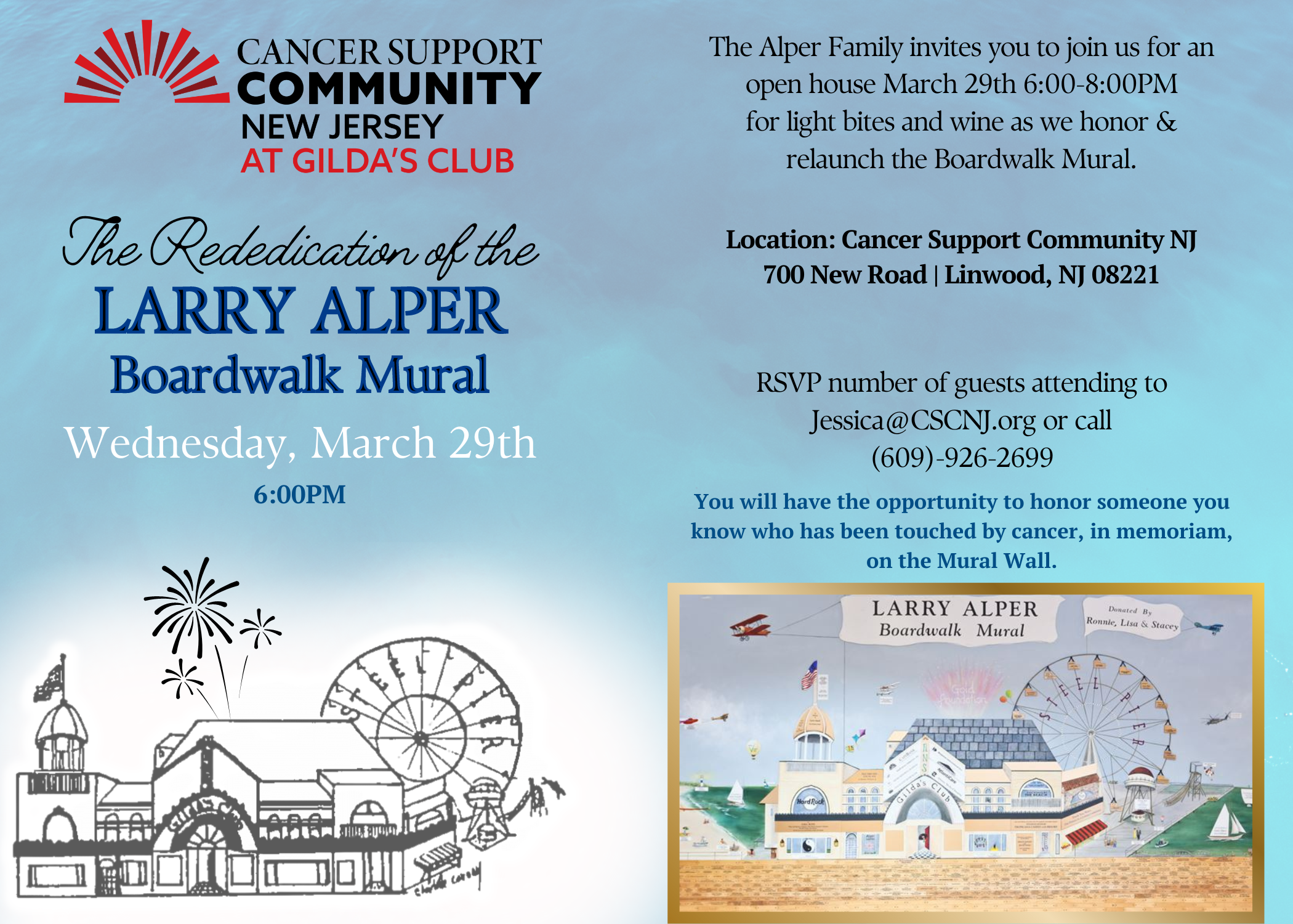 Larry Alper's family donated the Larry Alper Boardwalk Mural in his memory after he lost his battle with colon cancer. Larry was a successful developer in southeastern New Jersey-and at one time, the owner of the Steel Pier in Atlantic City. A beautiful donor wall depicting the famous Steel Pier is a very fitting way to honor his memory.