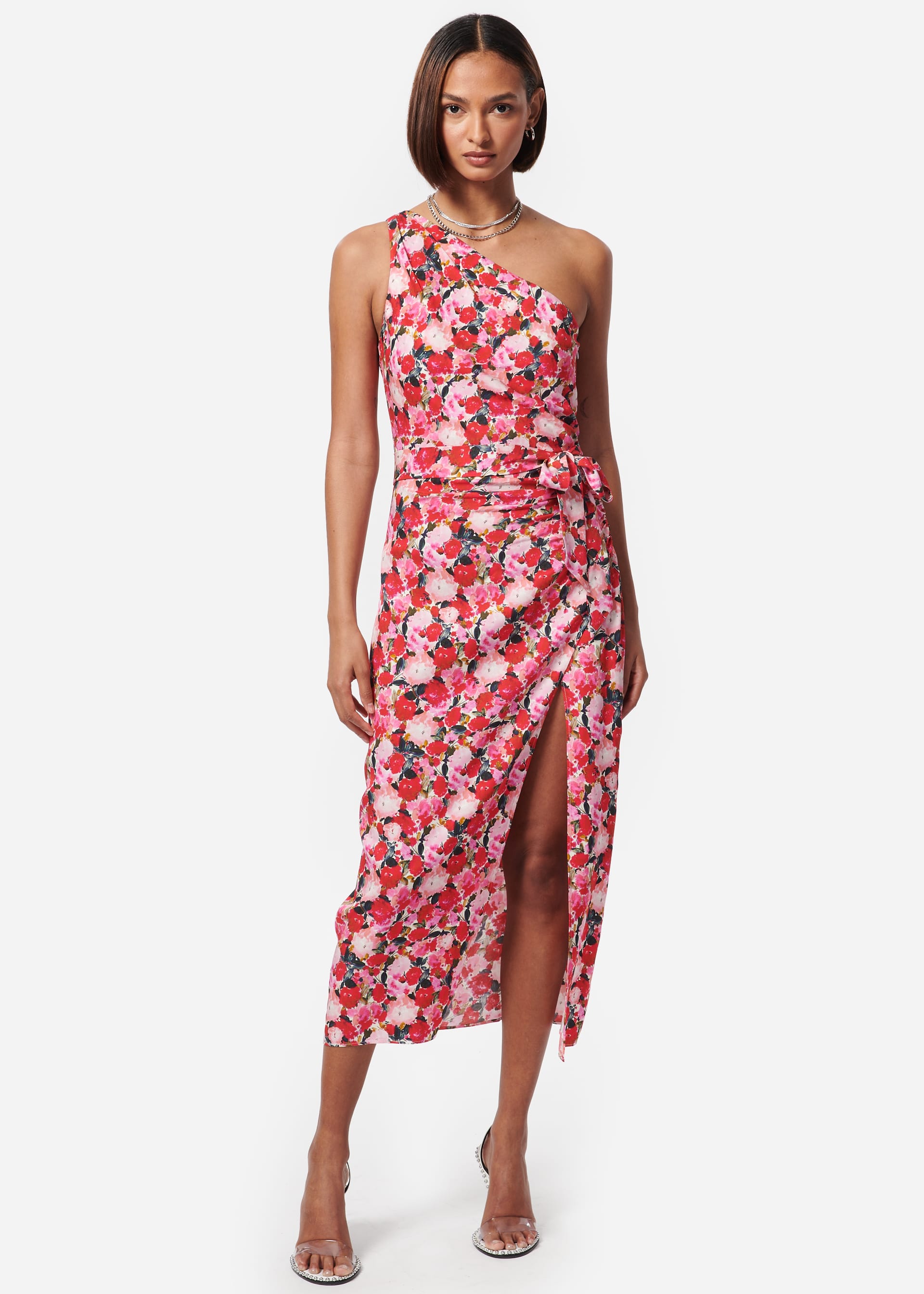 A standout piece that effortlessly blends modern style with timeless elegance. This dress is crafted from a lightweight fabric adorned with a vibrant floral pattern, making it perfect for summer occasions. The Hyper Blossom color palette features vivid pinks and reds that evoke the beauty of blooming gardens, adding a fresh and lively touch to your wardrobe. The dress is versatile enough to be dressed up with heels and statement jewelry for a formal event, or dressed down with sandals for a casual daytime look. $375 at caminyc.com.