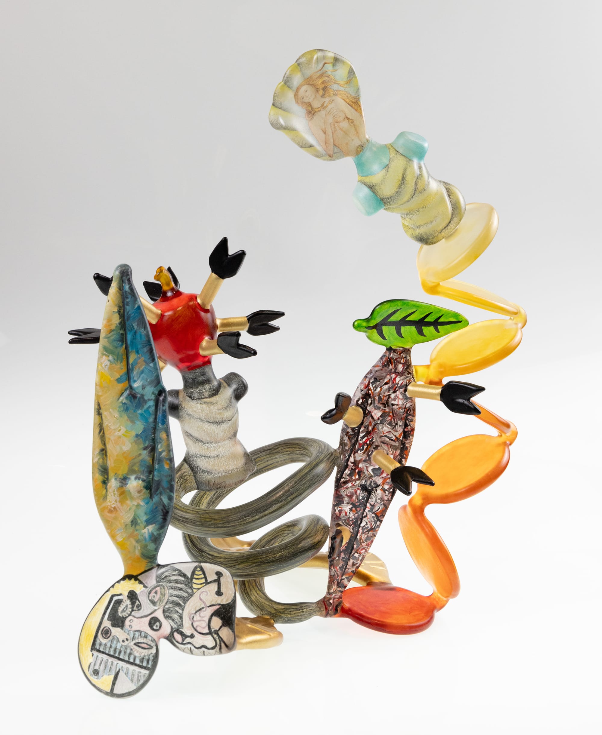 Clockwise from top left: Lucy Lyon (b. 1947), The Visit, c. 2012, Cast neodymium glass, metal, Photo courtesy of Lucy Lyon; Oben Abright (b. 1980), Gabe, 2009, Blown and cast glass, concrete, copper, Photo courtesy of Wheaton Arts; Ginny Ruffner (1952-2025), Toys of Art History, 1989, Flameworked glass, mixed media, Photo courtesy Wheaton Arts; Judith Schaechter (b. 1961), Fine Example, 2000, Stained, cut, polished, and engraved glass, Photo courtesy of Judith Schaechter